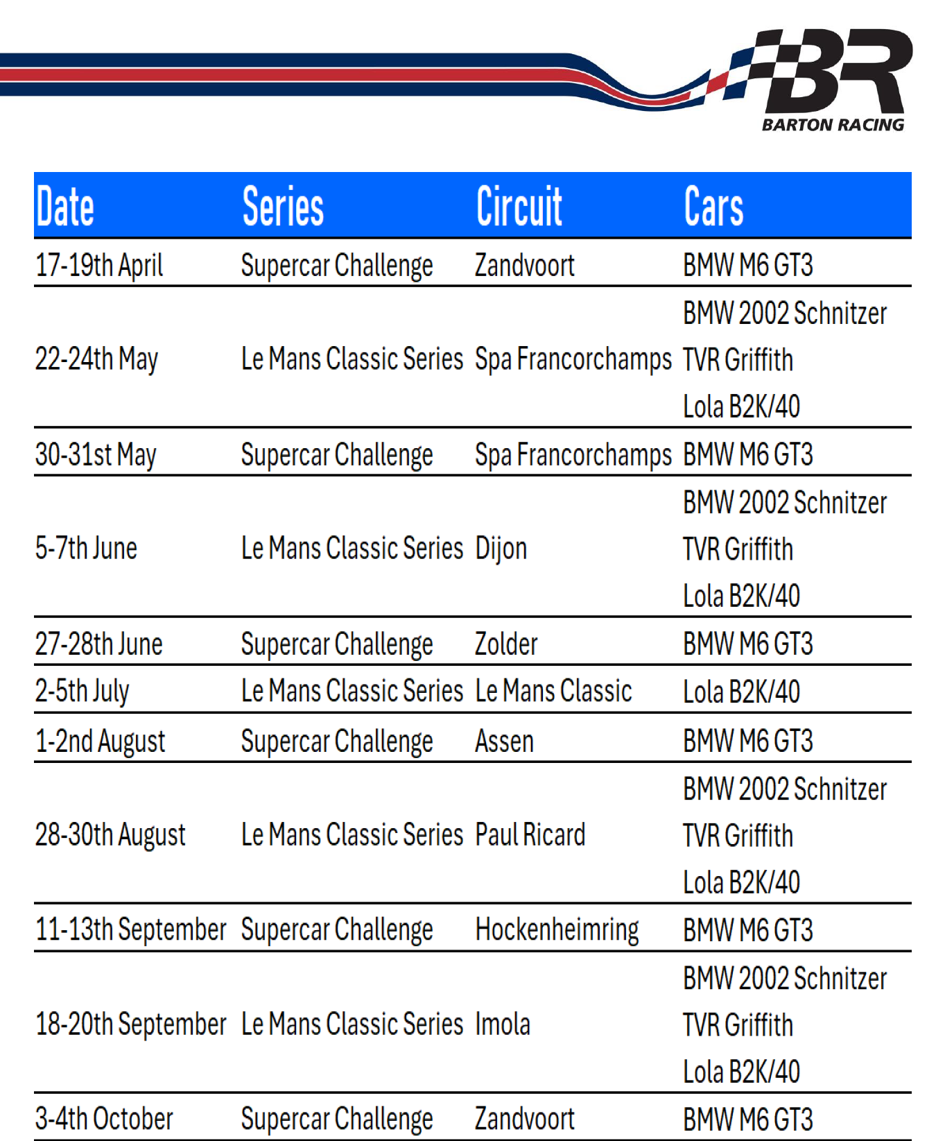Beginning in mid-April Harry is competing in the Dutch based Supercar Challenge, the next natural stepping stone in his career as he will be driving a BMW In the GT3 category, a division that attracts the cream of ambitious drivers sharing Harry’s ambition to be at the world’s premier endurance sportscar race. Also, and when time allows he will be campaigning one or more cars from the Barton Racing historic stable in the European Peter Auto series.